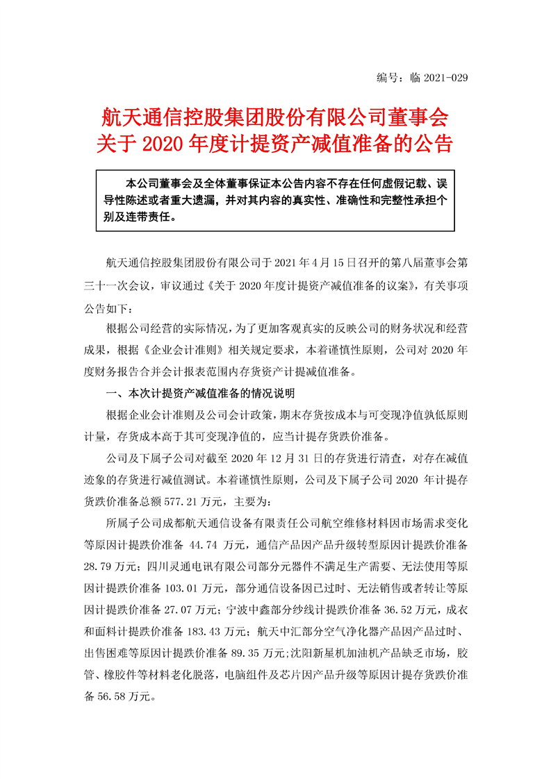 航天通信控股集團股份有限公司關于2020年度計提資產減值準備的公告